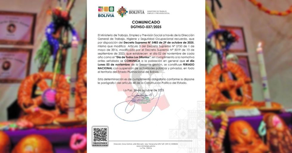 La Dirección General de Trabajo, Higiene y Seguridad Ocupacional de la cartera de Estado recordó que la disposición se ampara en el Decreto Supremo N° 5483 del 29 de octubre de 2025, el cual modifica normativas previas (DS N° 2750 y DS N° 5019) que establecen el 02 de noviembre de cada año como el “Día de Todos los Difuntos”.
