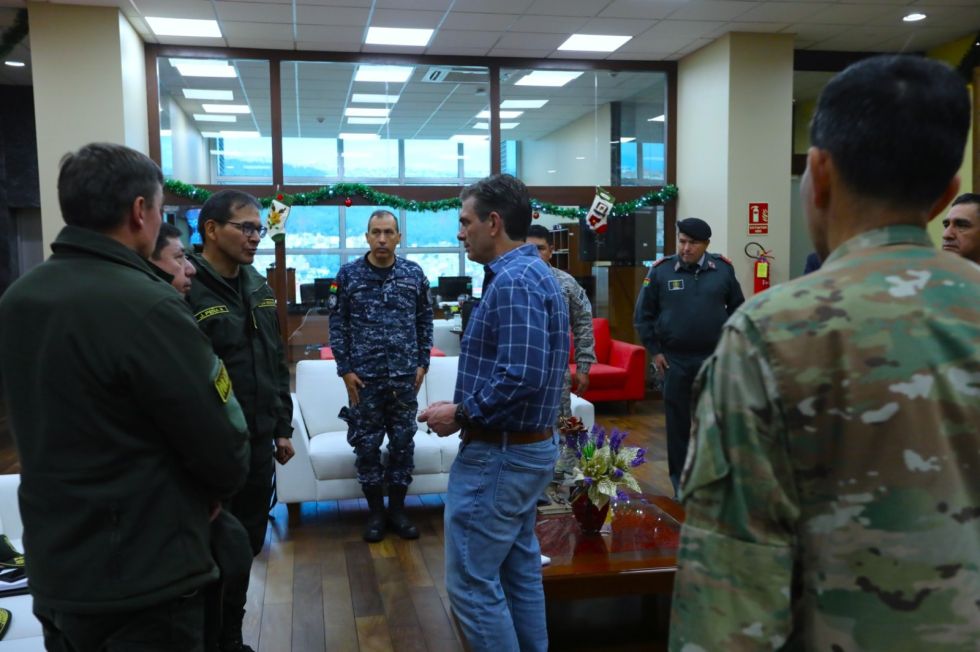 El viceministro de Defensa Social, Ernesto Justiniano, acompaña al presidente Paz en El Torno.