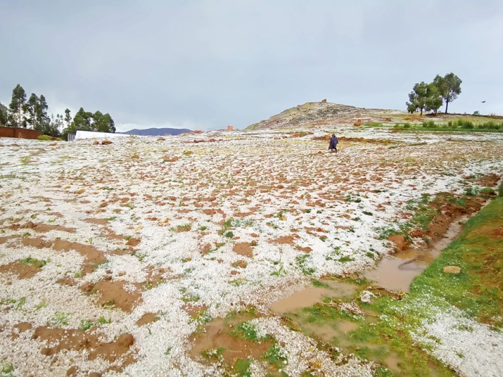 Una intensa granizada azotó la tarde de este lunes a la comunidad de Potolo, en el Distrito 8 de Sucre. El fenómeno meteorológico se registró apenas cuatro días después de que una tormenta similar causara estragos en otras comunidades de los distritos 6 y 8.