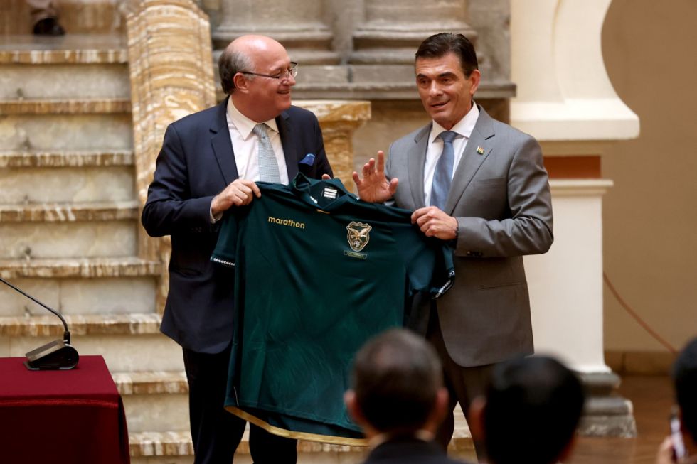 Tras concluir los discursos, el presidente Paz regaló al titular del BID una camiseta de la Selección Boliviana de fútbol con el nombre 'Ilan' impreso en la espalda.