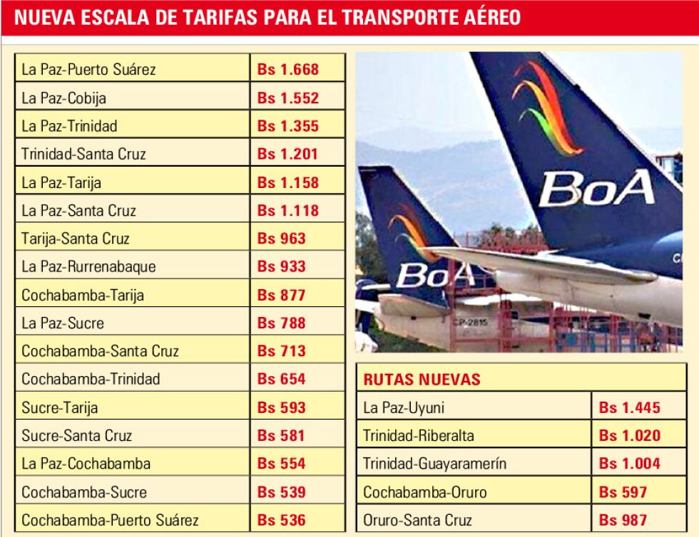 En el caso de las conexiones aéreas desde y hacia Sucre, la tarifa máxima de referencia del vuelo a La Paz es de Bs 773; a Santa Cruz, Bs 566; Cochabamba, Bs 524; y Tarija, Bs 578.