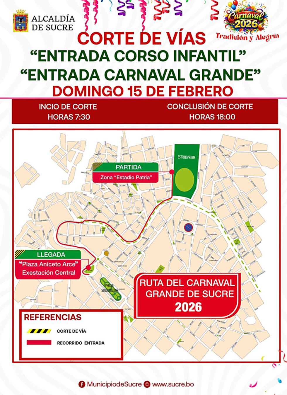 Finalmente, el domingo 15 de febrero, durante el Corso Infantil y la Entrada Grande de Sucre, el corte de vías se aplicará en las calles aledañas al estadio Patria, la Avenida Germán Mendoza, el sector del Tribunal Departamental de Justicia y la plaza Aniceto Arce, también de 7:30 a 18:00.