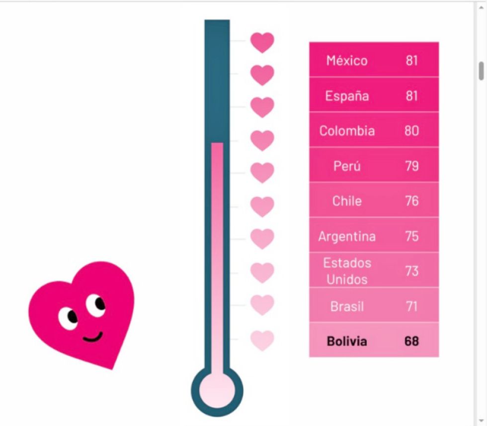 En este ranking, Bolivia aparece al final, lo que significa que hay un sentimiento de menor plenitud en el amor que en el resto de países de América Latina y Norteamérica. Mientras en México, Colombia o Perú, la gran mayoría anda muy feliz con su pareja, en Bolivia hay sensación de que falta un poquito más de “chispa” o estabilidad afectiva para estar al nivel del promedio latinoamericano.