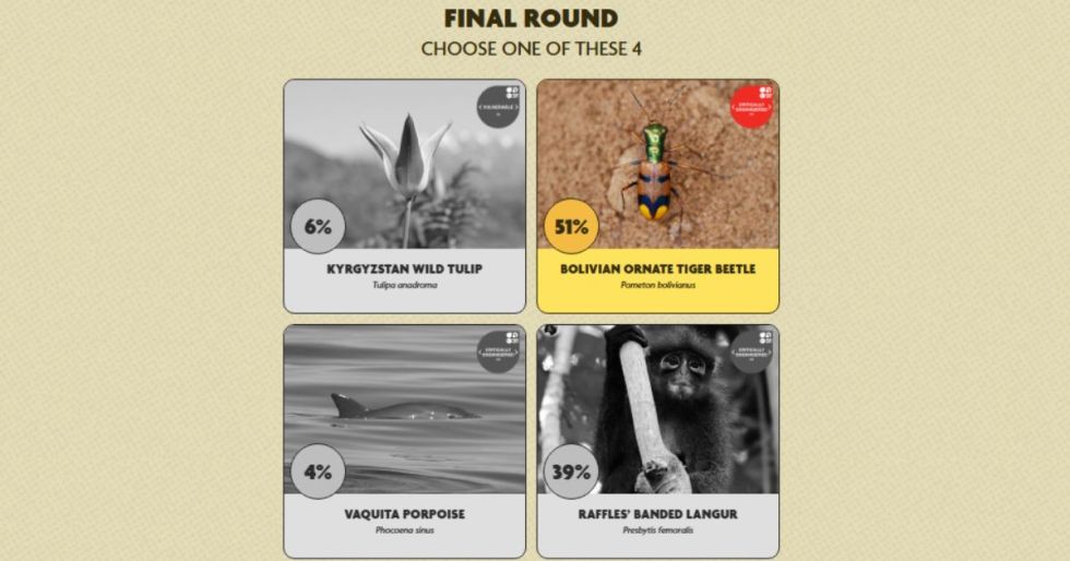 Este viernes 3 de abril es el último día para votar de manera virtual en el Desafío de Conservación de Uproar, organizado por el Zoológico de Indianápolis y la UICN. El escarabajo tigre chiquitano de Bolivia lidera la votación con el 51% de los votos, seguido por un mono suril con el 39%. El tulipán salvaje de Kyrgystán y la vaquita marina ocupan los últimos lugares con el 6% y 4%, respectivamente.